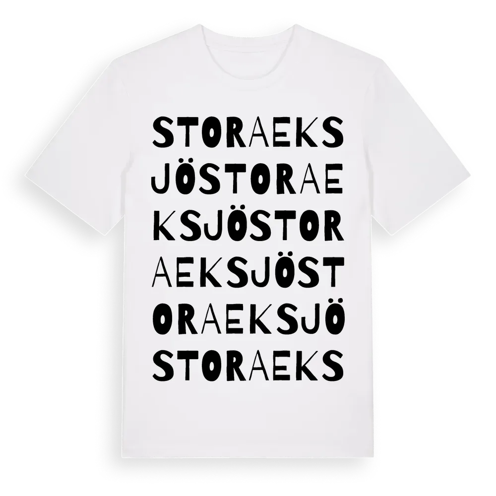 Stora Eksjö ordlek t-shirt är inspirerad av Stora Eksjö i Stockholms län, Sverige. Tröjan är designad för dig som har en speciell koppling till platsen – oavsett om du bor här, har rötterna här eller bara älskar Stora Eksjö.