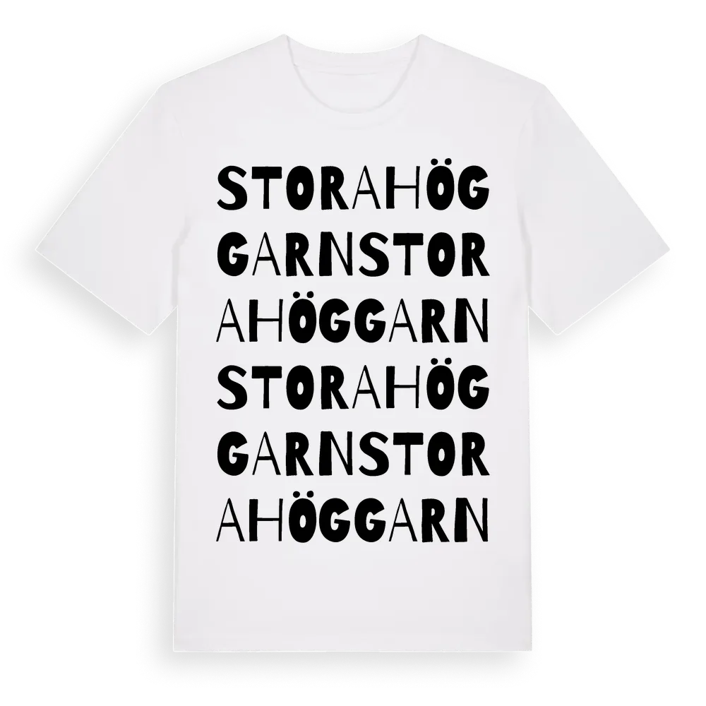 Stora Höggarn ordlek t-shirt är inspirerad av ön Stora Höggarn i Stockholms län, Sverige. Tröjan är designad för dig som har en speciell koppling till platsen – oavsett om du bor här, har rötterna här eller bara älskar Stora Höggarn.