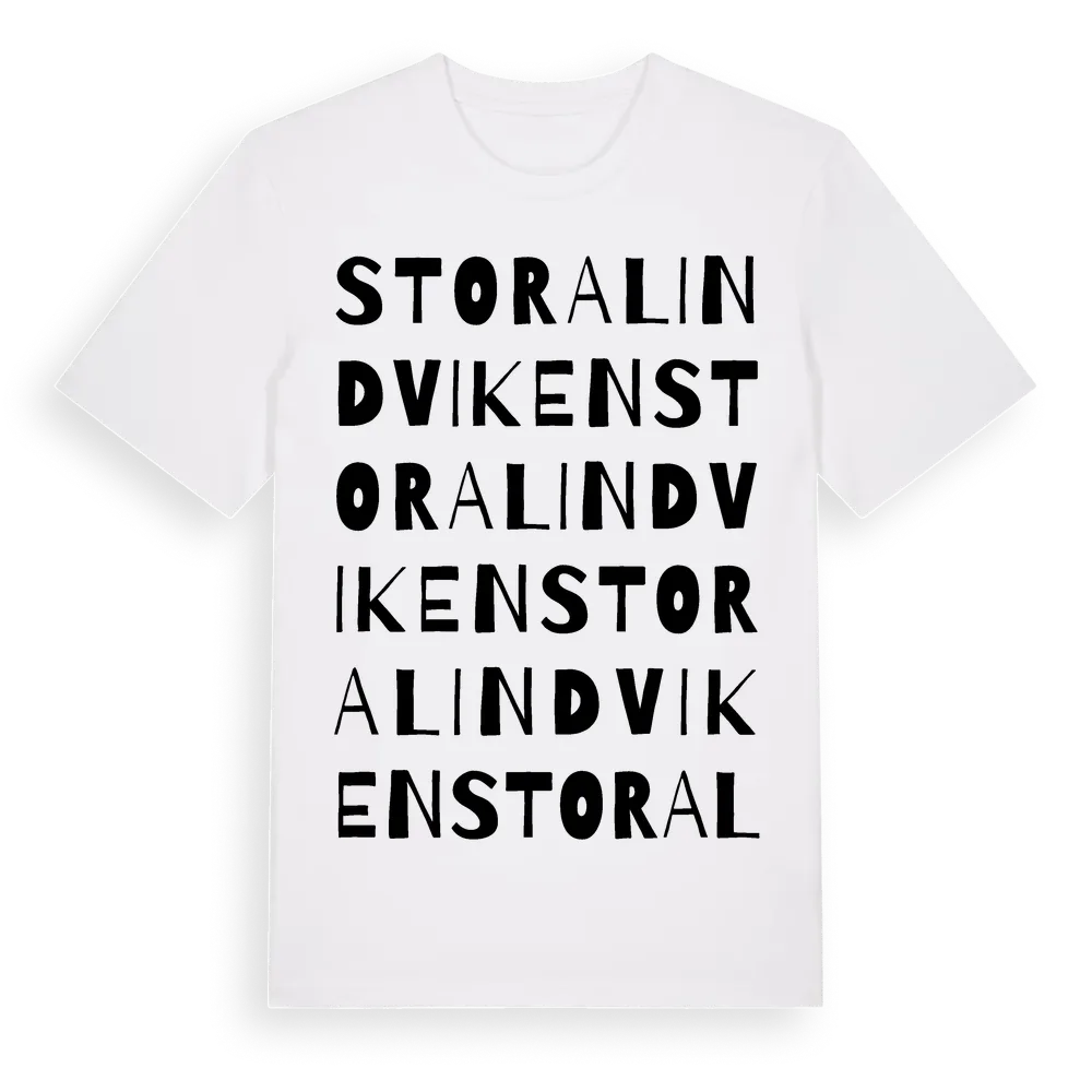 Stora Lindviken ordlek t-shirt är inspirerad av Stora Lindviken i Stockholms län, Sverige. Tröjan är designad för dig som har en speciell koppling till platsen – oavsett om du bor här, har rötterna här eller bara älskar Stora Lindviken.