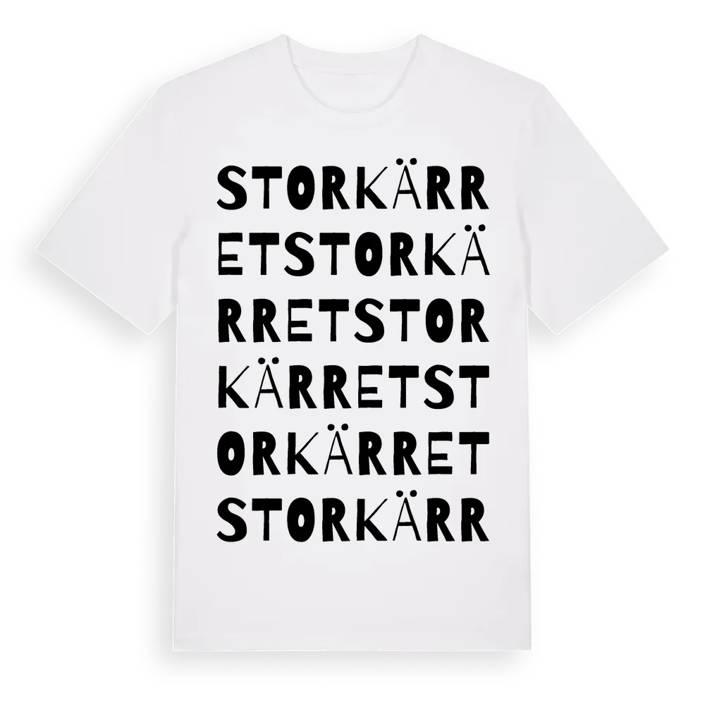 Storkärret ordlek t-shirt är inspirerad av Storkärret i Stockholms län, Sverige. Tröjan är designad för dig som har en speciell koppling till platsen – oavsett om du bor här, har rötterna här eller bara älskar Storkärret.