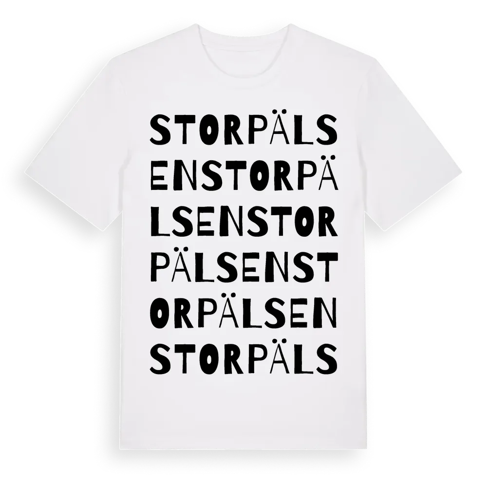 Storpälsen ordlek t-shirt är inspirerad av Storpälsen i Stockholms län, Sverige. Tröjan är designad för dig som har en speciell koppling till platsen – oavsett om du bor här, har rötterna här eller bara älskar Storpälsen.