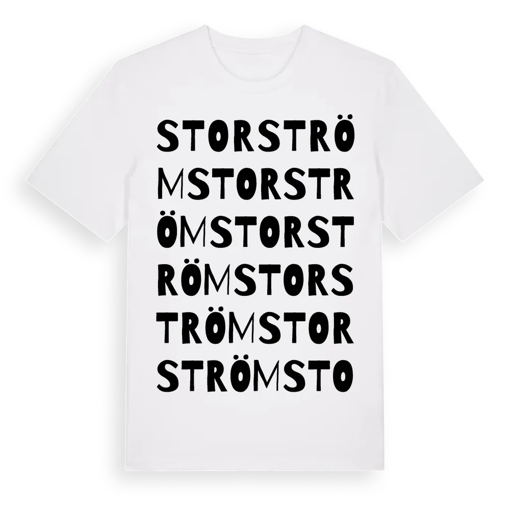Storström ordlek t-shirt är inspirerad av byn Storström i Stockholms län, Sverige. Tröjan är designad för dig som har en speciell koppling till platsen – oavsett om du bor här, har rötterna här eller bara älskar Storström.
