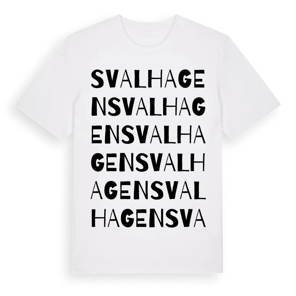 Svalhagen ordlek t-shirt är inspirerad av Svalhagen i Stockholms län, Sverige. Tröjan är designad för dig som har en speciell koppling till platsen – oavsett om du bor här, har rötterna här eller bara älskar Svalhagen.