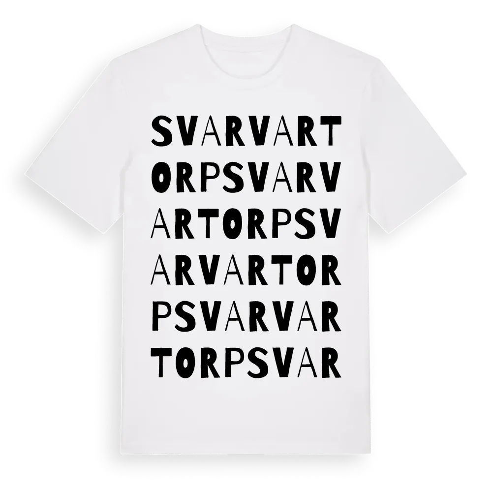 Svarvartorp ordlek t-shirt är inspirerad av Svarvartorp i Stockholms län, Sverige. Tröjan är designad för dig som har en speciell koppling till platsen – oavsett om du bor här, har rötterna här eller bara älskar Svarvartorp.