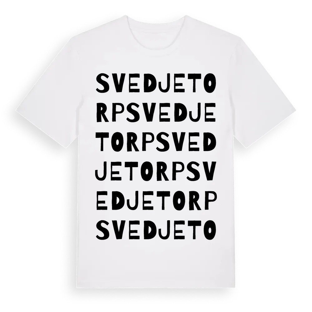Svedjetorp ordlek t-shirt är inspirerad av Svedjetorp i Stockholms län, Sverige. Tröjan är designad för dig som har en speciell koppling till platsen – oavsett om du bor här, har rötterna här eller bara älskar Svedjetorp.