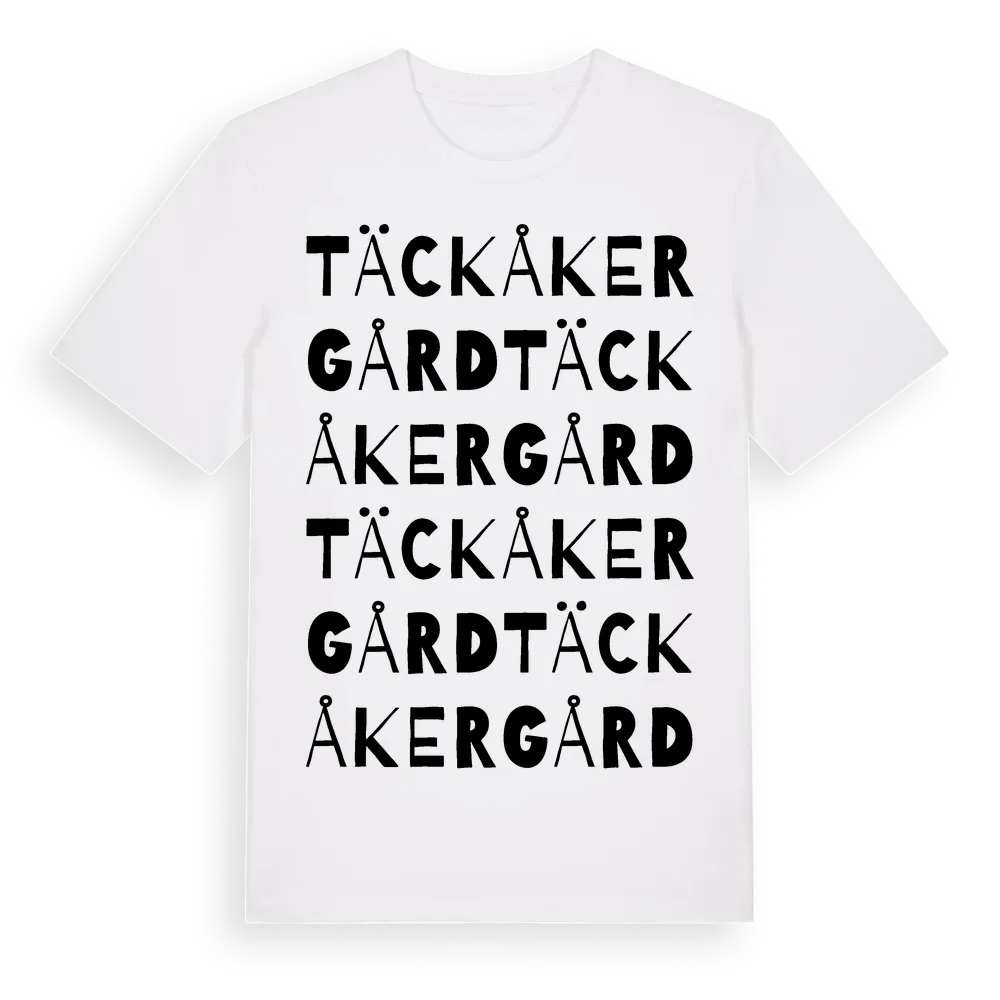 Täckåker Gård ordlek t-shirt är inspirerad av Täckåker Gård i Stockholms län, Sverige. Tröjan är designad för dig som har en speciell koppling till platsen – oavsett om du bor här, har rötterna här eller bara älskar Täckåker Gård.