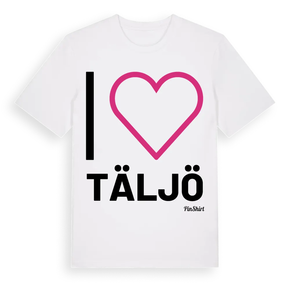 Det klassiska "I ❤ Täljö"-motivet i stort format som täcker hela bröstet. För dig som vill visa kärleken till Täljö på riktigt. Premium bomull, unisex – från byn Täljö i Stockholms län.