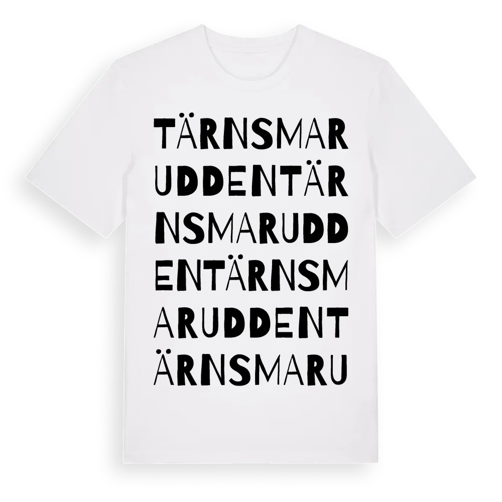 Tärnsmarudden ordlek t-shirt är inspirerad av Tärnsmarudden i Stockholms län, Sverige. Tröjan är designad för dig som har en speciell koppling till platsen – oavsett om du bor här, har rötterna här eller bara älskar Tärnsmarudden.