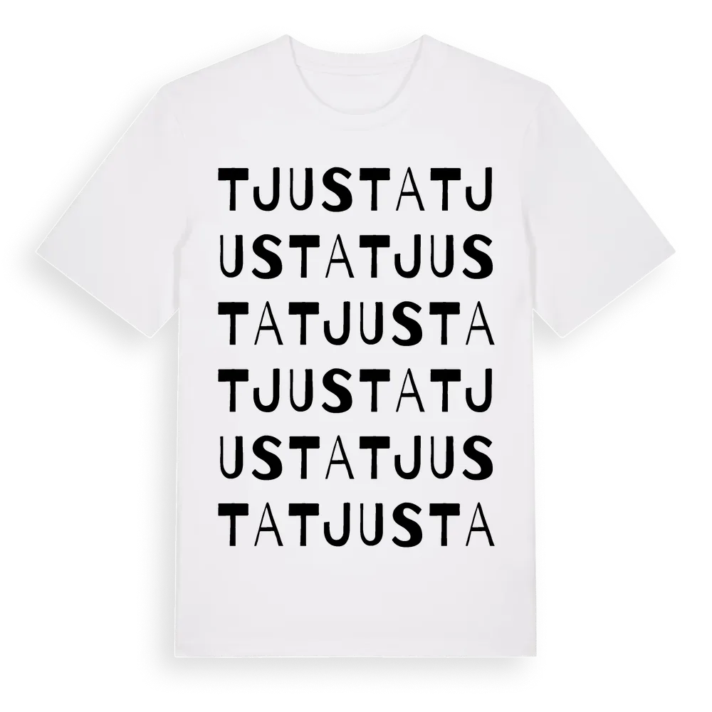 En ordlek byggd på Tjustas namn. Subtilt och klurig – ett motiv som bara de som verkligen känner platsen fullt ut förstår. Premium bomull, unisex – från Tjusta i Stockholms län.