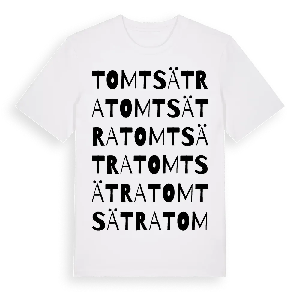 Tomtsätra ordlek t-shirt är inspirerad av Tomtsätra i Stockholms län, Sverige. Tröjan är designad för dig som har en speciell koppling till platsen – oavsett om du bor här, har rötterna här eller bara älskar Tomtsätra.