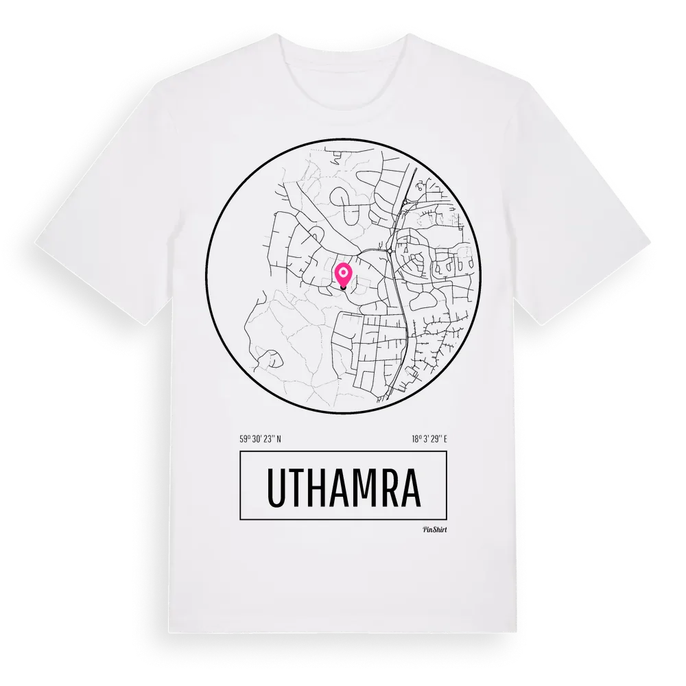 Uthamra t-shirt är inspirerad av stadsdelen Uthamra i Stockholms län, Sverige. Tröjan är designad för dig som har en speciell koppling till platsen – oavsett om du bor här, har rötterna här eller bara älskar Uthamra.