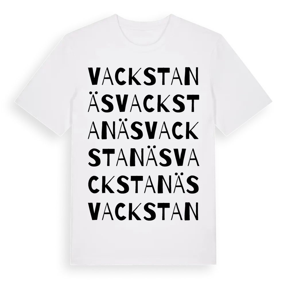 Vackstanäs ordlek t-shirt är inspirerad av byn Vackstanäs i Stockholms län, Sverige. Tröjan är designad för dig som har en speciell koppling till platsen – oavsett om du bor här, har rötterna här eller bara älskar Vackstanäs.