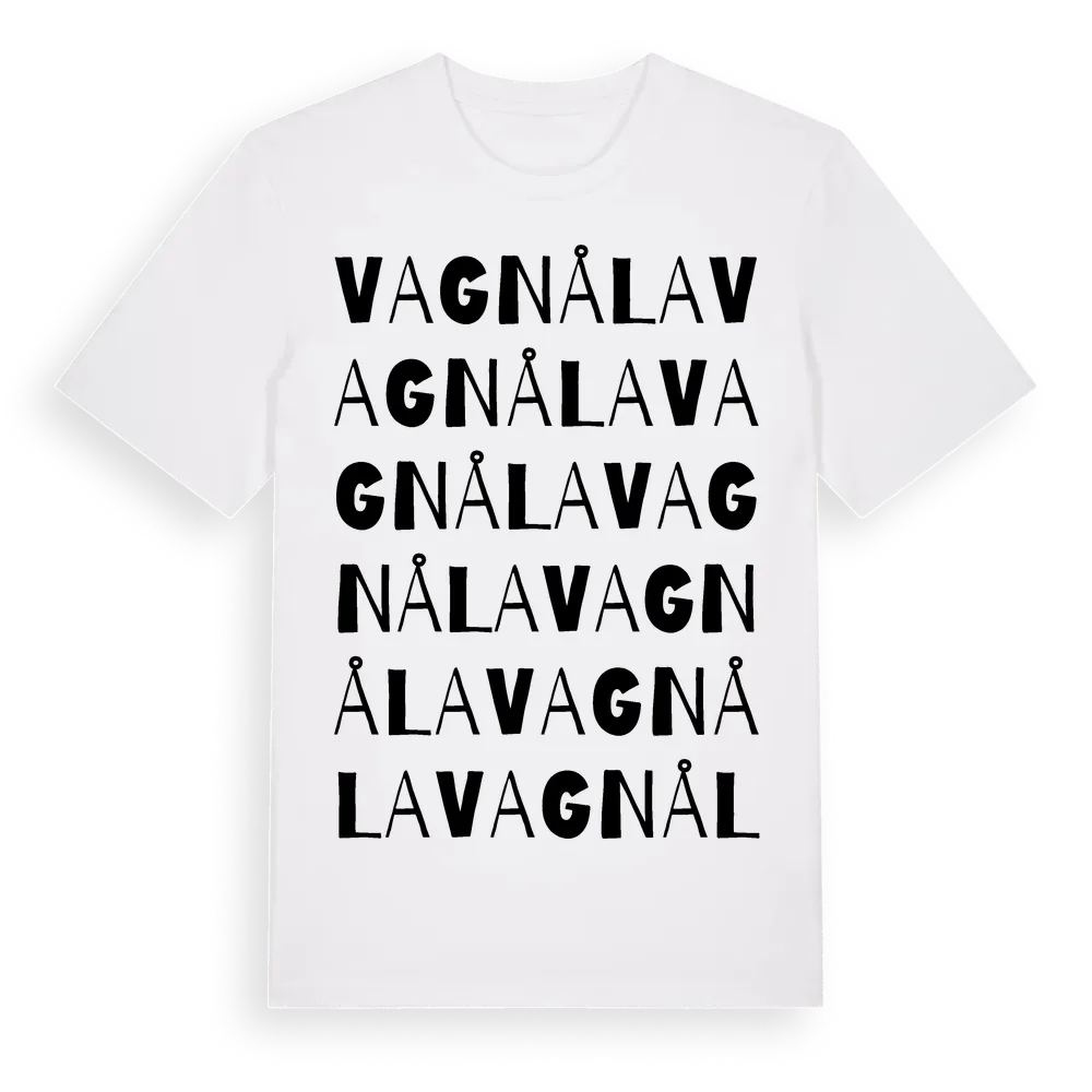 Vagnåla ordlek t-shirt är inspirerad av Vagnåla i Stockholms län, Sverige. Tröjan är designad för dig som har en speciell koppling till platsen – oavsett om du bor här, har rötterna här eller bara älskar Vagnåla.