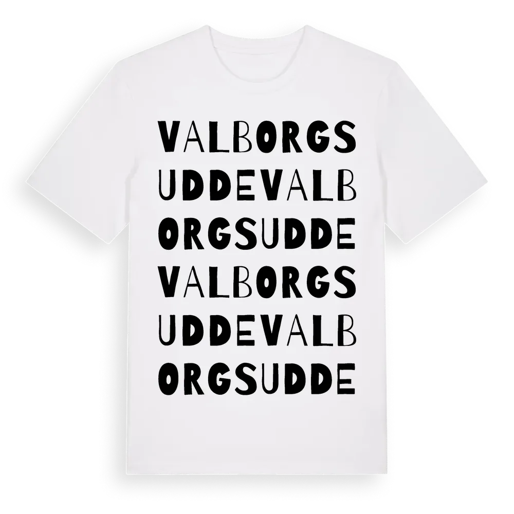 Valborgsudde ordlek t-shirt är inspirerad av Valborgsudde i Stockholms län, Sverige. Tröjan är designad för dig som har en speciell koppling till platsen – oavsett om du bor här, har rötterna här eller bara älskar Valborgsudde.