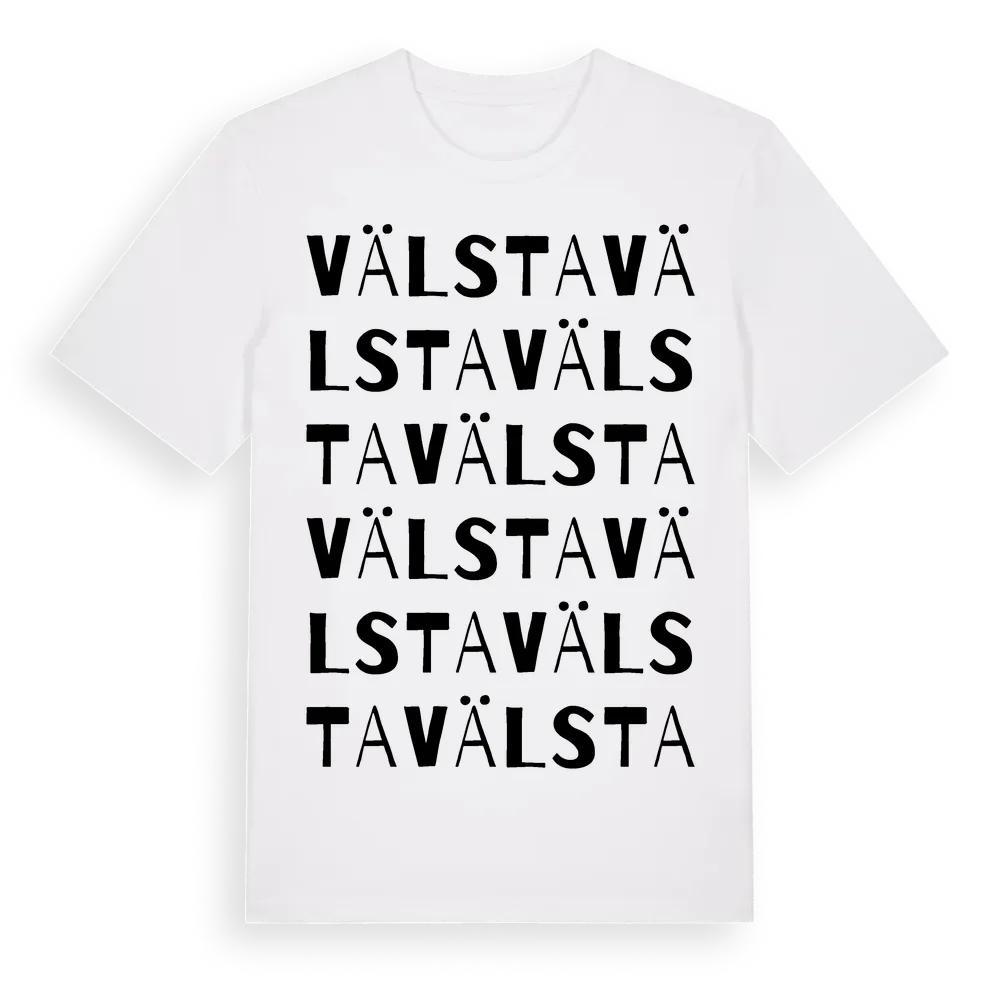 Välsta ordlek t-shirt är inspirerad av byn Välsta i Stockholms län, Sverige. Tröjan är designad för dig som har en speciell koppling till platsen – oavsett om du bor här, har rötterna här eller bara älskar Välsta.