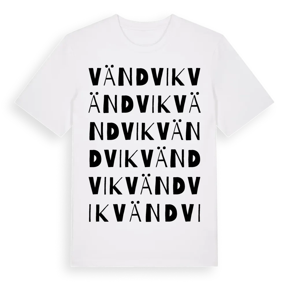 Vändvik ordlek t-shirt är inspirerad av Vändvik i Stockholms län, Sverige. Tröjan är designad för dig som har en speciell koppling till platsen – oavsett om du bor här, har rötterna här eller bara älskar Vändvik.