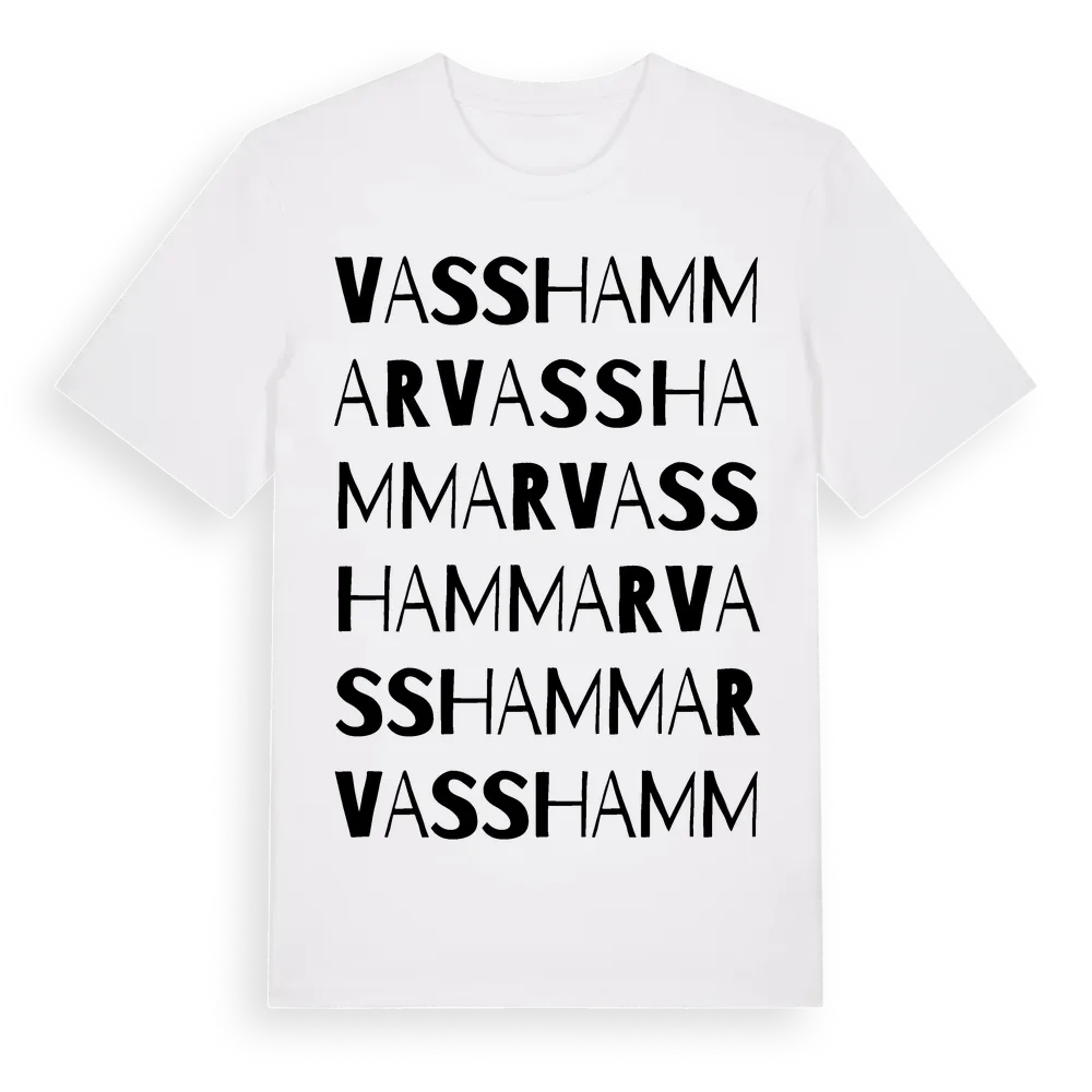 Vasshammar ordlek t-shirt är inspirerad av byn Vasshammar i Stockholms län, Sverige. Tröjan är designad för dig som har en speciell koppling till platsen – oavsett om du bor här, har rötterna här eller bara älskar Vasshammar.