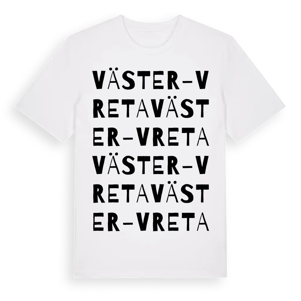 En ordlek byggd på Väster-Vretas namn. Subtilt och klurig – ett motiv som bara de som verkligen känner platsen fullt ut förstår. Premium bomull, unisex – från Väster-Vreta i Stockholms län.