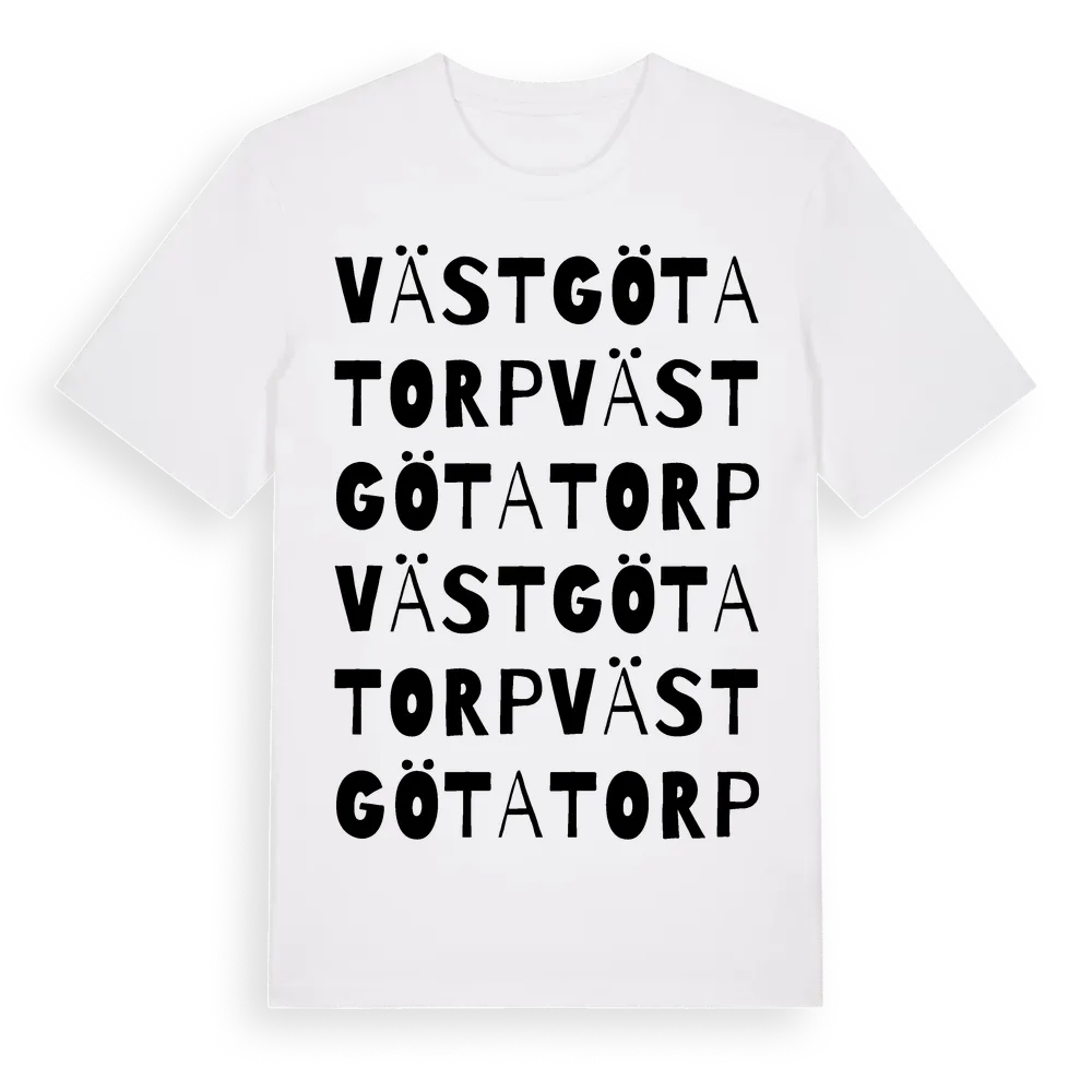 Västgötatorp ordlek t-shirt är inspirerad av Västgötatorp i Stockholms län, Sverige. Tröjan är designad för dig som har en speciell koppling till platsen – oavsett om du bor här, har rötterna här eller bara älskar Västgötatorp.