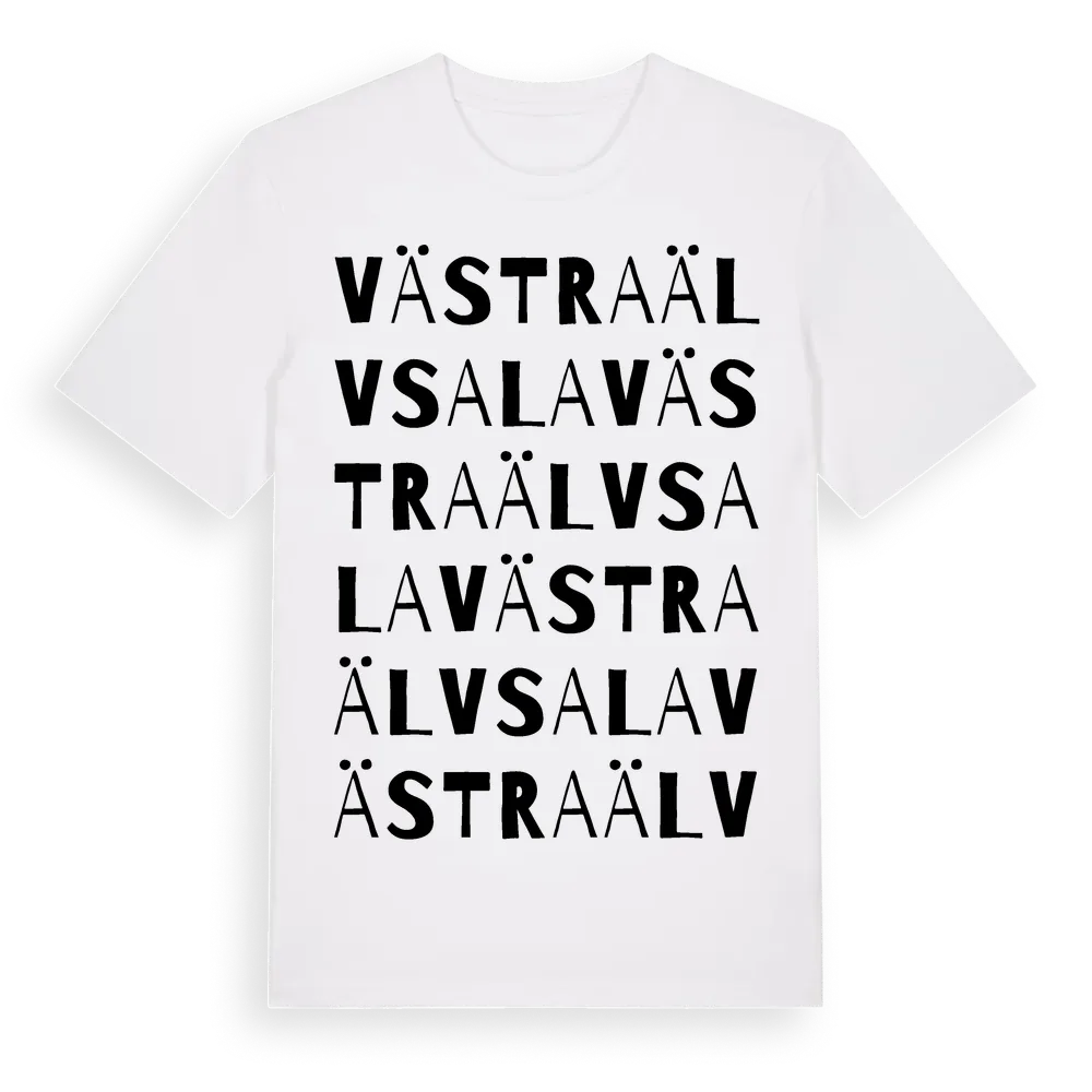 Västra Älvsala ordlek t-shirt är inspirerad av byn Västra Älvsala i Stockholms län, Sverige. Tröjan är designad för dig som har en speciell koppling till platsen – oavsett om du bor här, har rötterna här eller bara älskar Västra Älvsala.