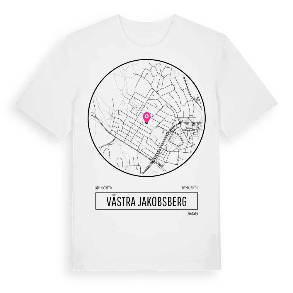Västra Jakobsberg t-shirt är inspirerad av byn Västra Jakobsberg i Stockholms län, Sverige. Tröjan är designad för dig som har en speciell koppling till platsen – oavsett om du bor här, har rötterna här eller bara älskar Västra Jakobsberg.