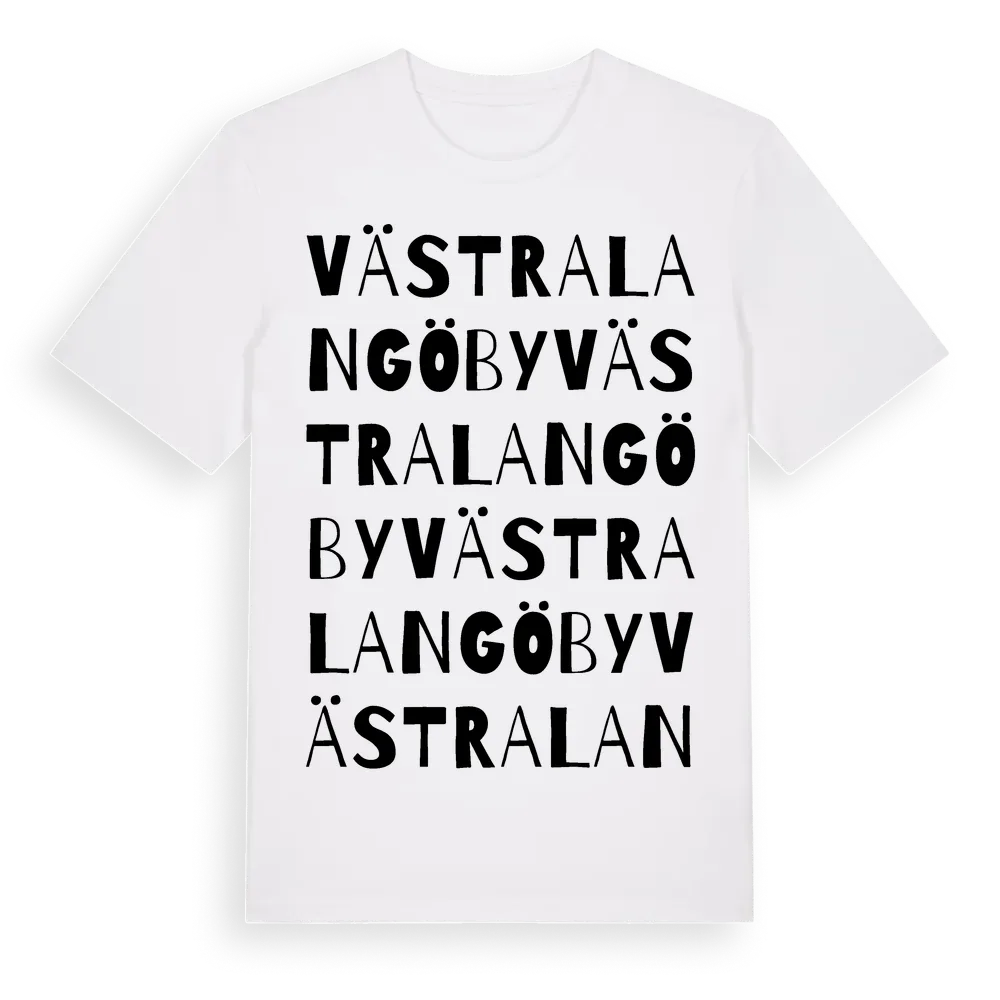 Västra Langö By ordlek t-shirt är inspirerad av byn Västra Langö By i Stockholms län, Sverige. Tröjan är designad för dig som har en speciell koppling till platsen – oavsett om du bor här, har rötterna här eller bara älskar Västra Langö By.