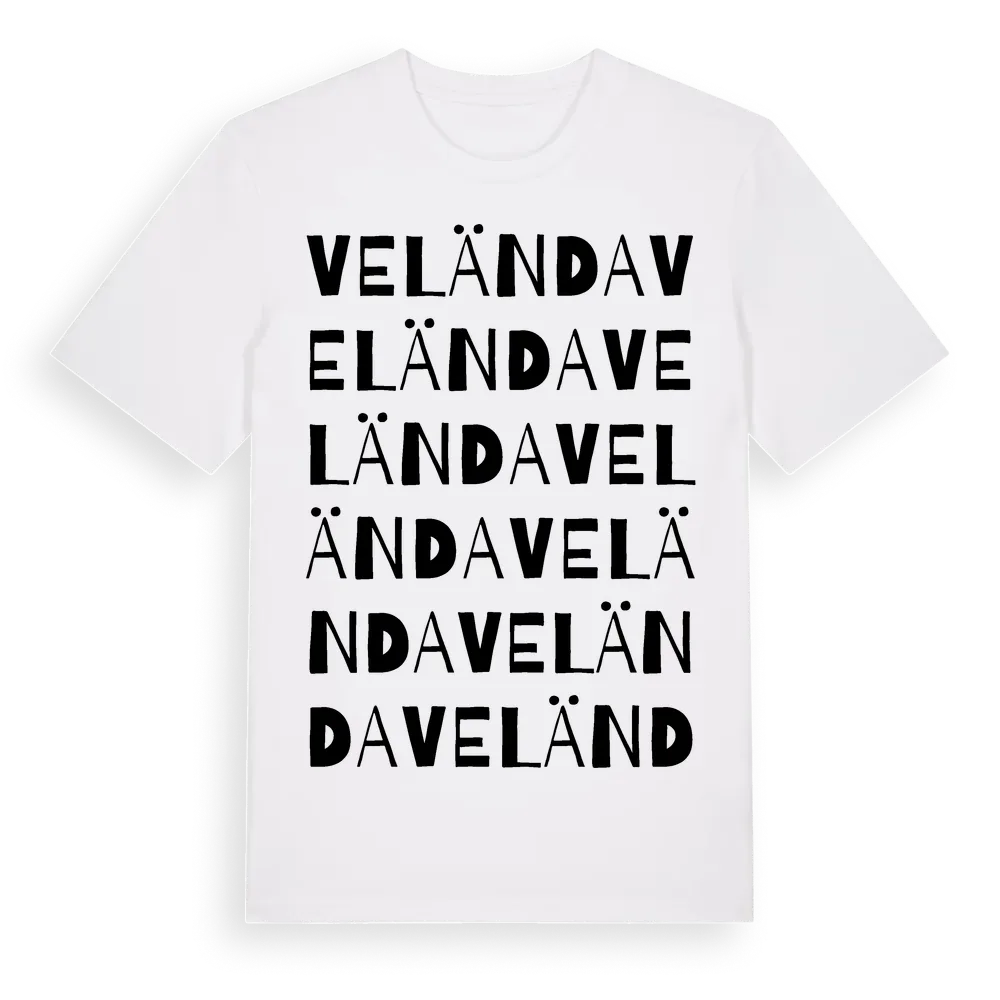 Velända ordlek t-shirt är inspirerad av byn Velända i Stockholms län, Sverige. Tröjan är designad för dig som har en speciell koppling till platsen – oavsett om du bor här, har rötterna här eller bara älskar Velända.
