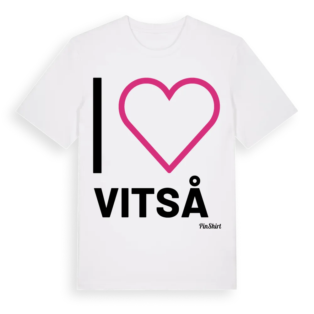 Det klassiska "I ❤ Vitså"-motivet i stort format som täcker hela bröstet. För dig som vill visa kärleken till Vitså på riktigt. Premium bomull, unisex – från Vitså i Stockholms län.
