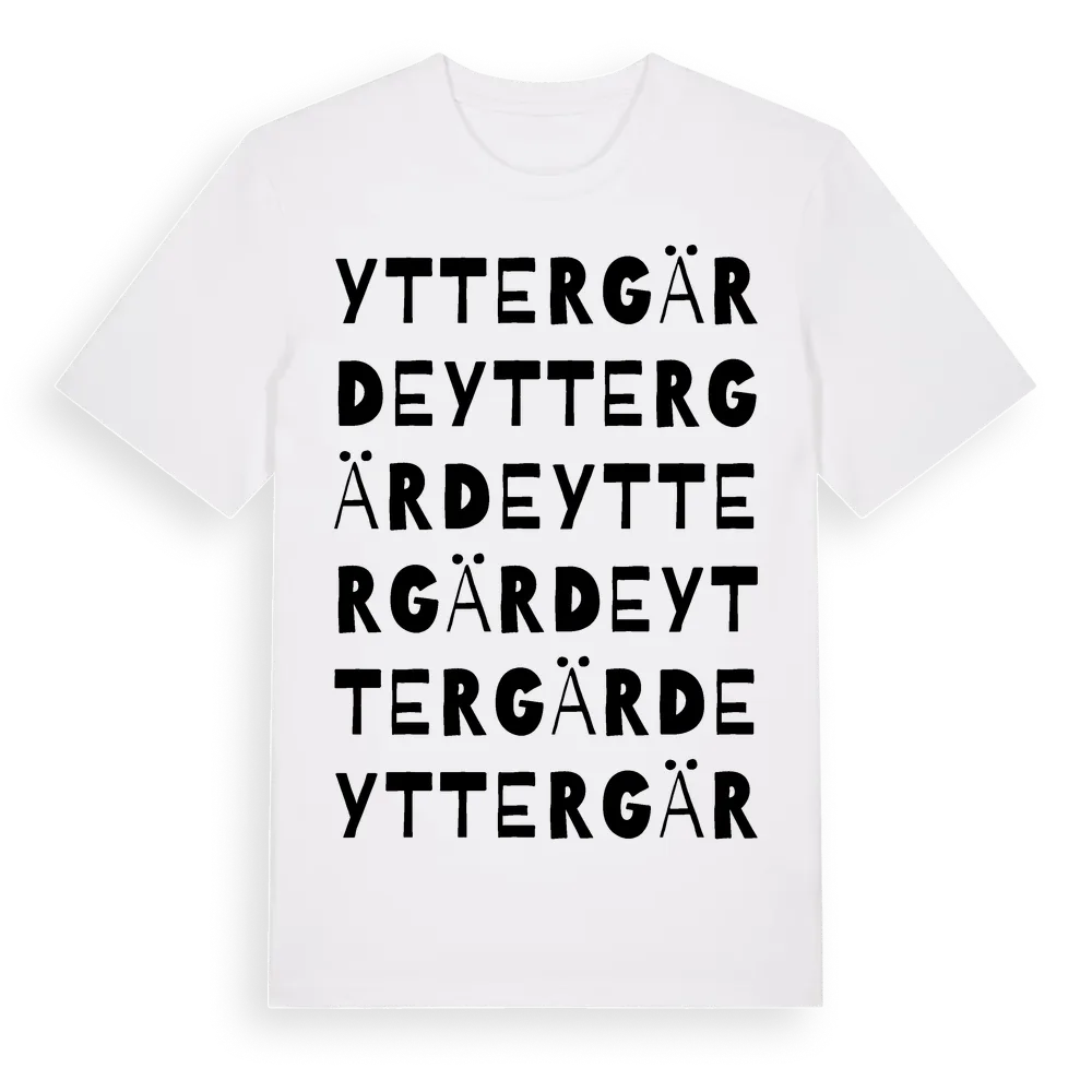 Yttergärde ordlek t-shirt är inspirerad av Yttergärde i Stockholms län, Sverige. Tröjan är designad för dig som har en speciell koppling till platsen – oavsett om du bor här, har rötterna här eller bara älskar Yttergärde.