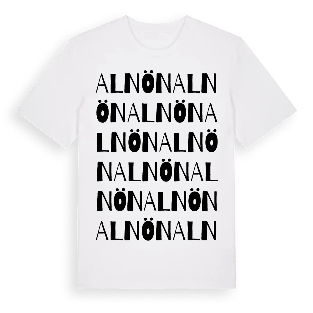 Alnön ordlek t-shirt är inspirerad av ön Alnön i Uppsala län, Sverige. Tröjan är designad för dig som har en speciell koppling till platsen – oavsett om du bor här, har rötterna här eller bara älskar Alnön.