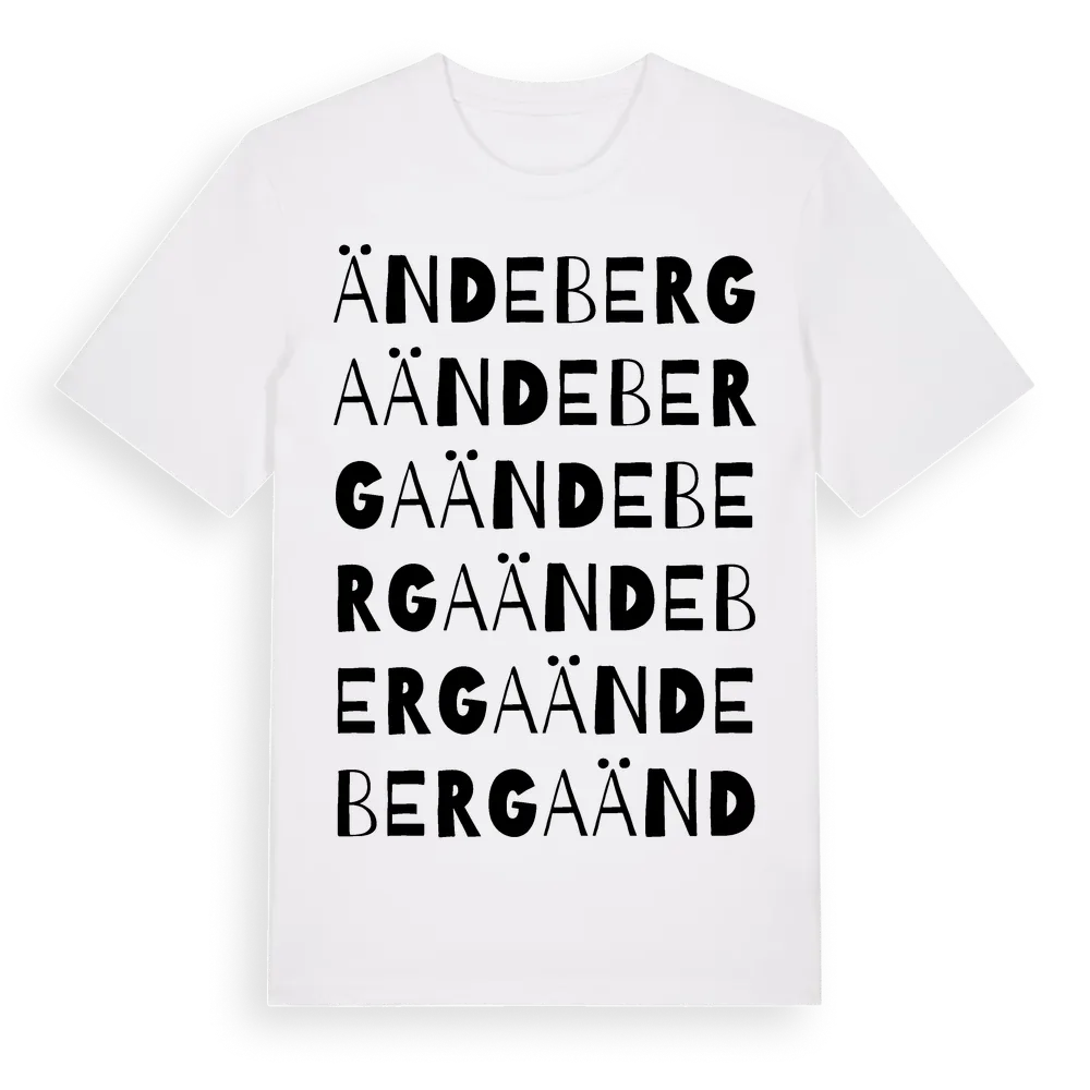 Ändeberga ordlek t-shirt är inspirerad av Ändeberga i Uppsala län, Sverige. Tröjan är designad för dig som har en speciell koppling till platsen – oavsett om du bor här, har rötterna här eller bara älskar Ändeberga.