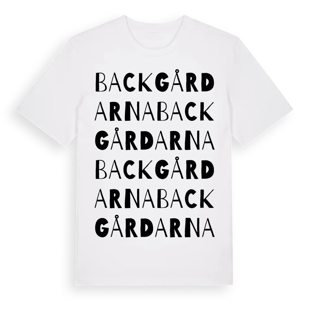 Backgårdarna ordlek t-shirt är inspirerad av Backgårdarna i Uppsala län, Sverige. Tröjan är designad för dig som har en speciell koppling till platsen – oavsett om du bor här, har rötterna här eller bara älskar Backgårdarna.