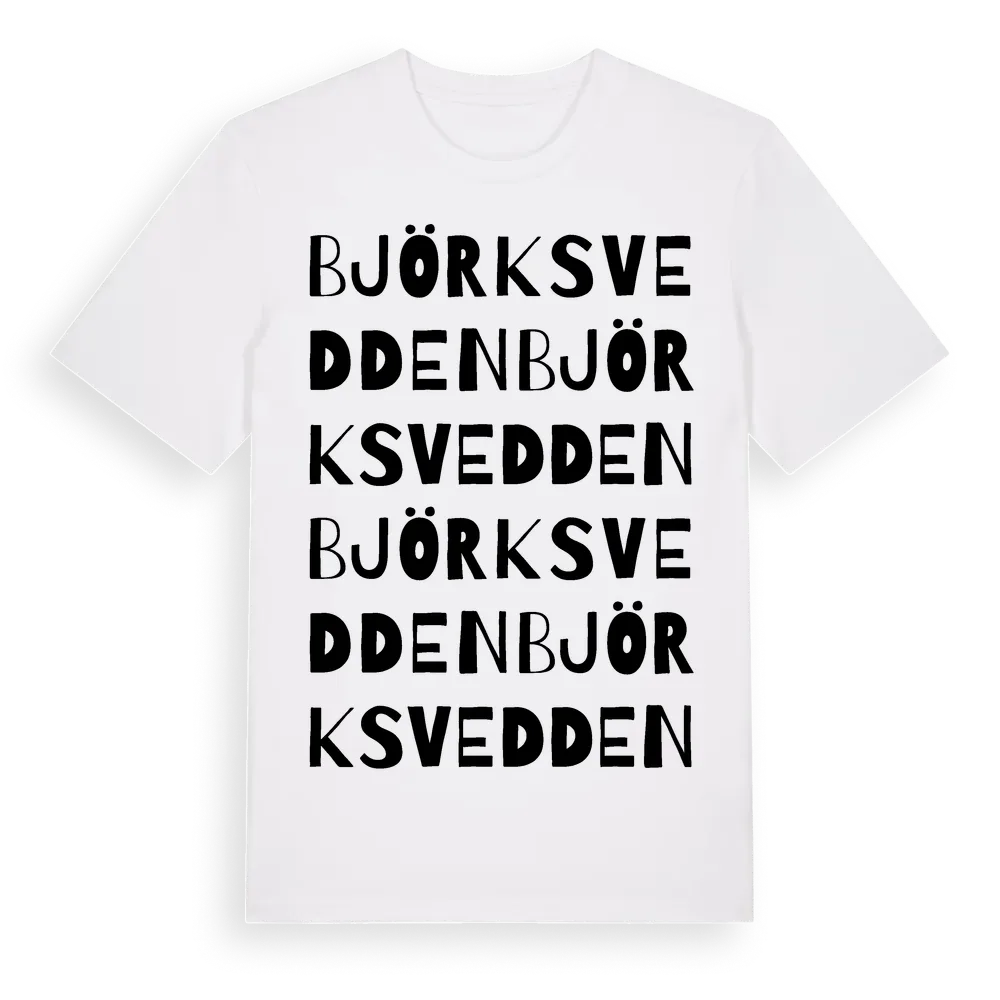 Björksvedden ordlek t-shirt är inspirerad av Björksvedden i Uppsala län, Sverige. Tröjan är designad för dig som har en speciell koppling till platsen – oavsett om du bor här, har rötterna här eller bara älskar Björksvedden.