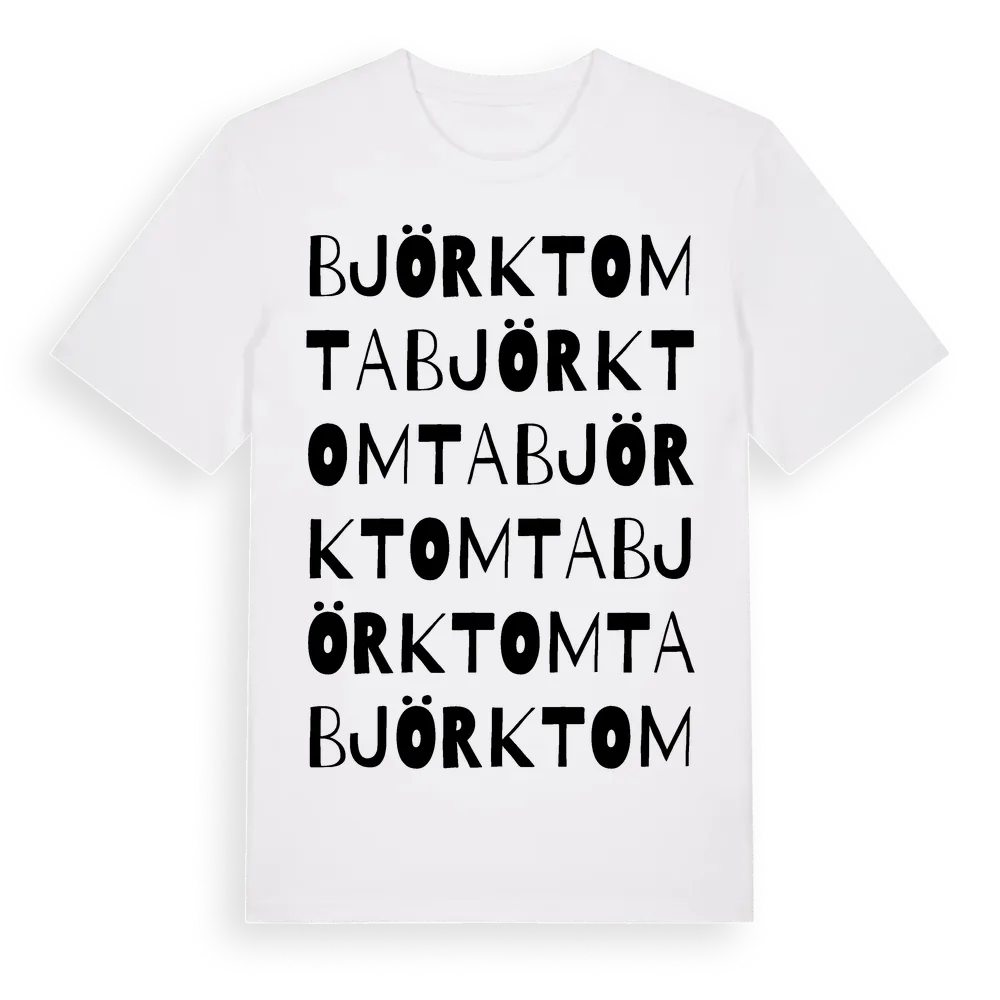 Björktomta ordlek t-shirt är inspirerad av Björktomta i Uppsala län, Sverige. Tröjan är designad för dig som har en speciell koppling till platsen – oavsett om du bor här, har rötterna här eller bara älskar Björktomta.