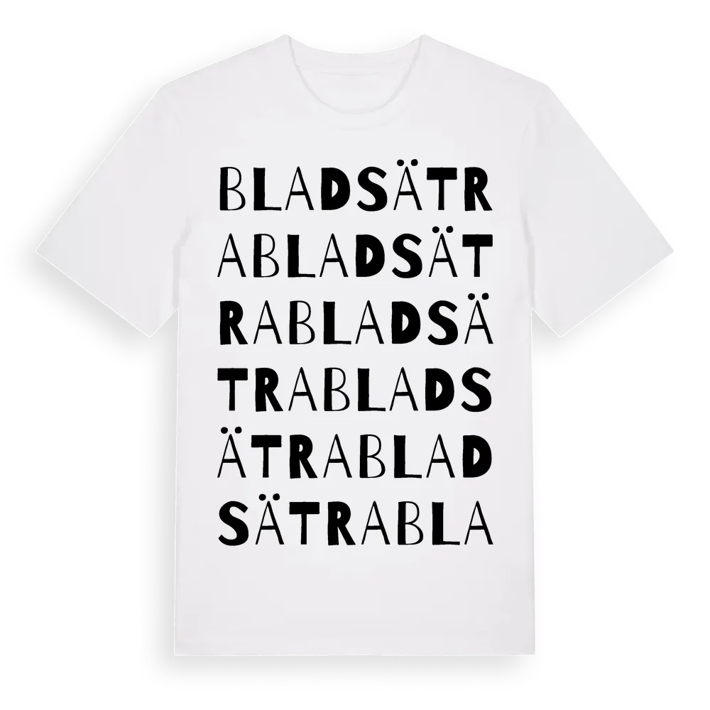 Bladsätra ordlek t-shirt är inspirerad av Bladsätra i Uppsala län, Sverige. Tröjan är designad för dig som har en speciell koppling till platsen – oavsett om du bor här, har rötterna här eller bara älskar Bladsätra.