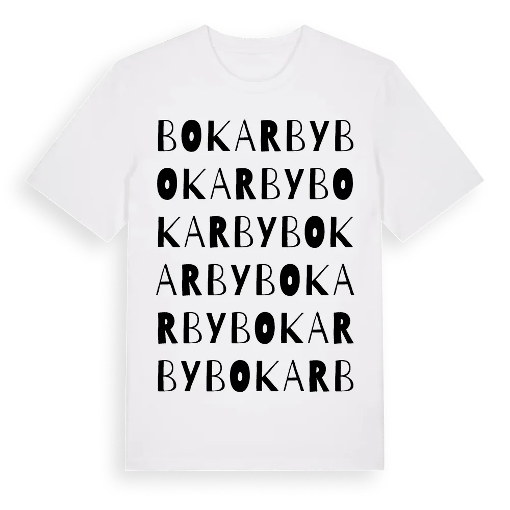Bokarby ordlek t-shirt är inspirerad av byn Bokarby i Uppsala län, Sverige. Tröjan är designad för dig som har en speciell koppling till platsen – oavsett om du bor här, har rötterna här eller bara älskar Bokarby.
