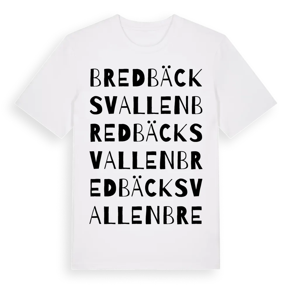 Bredbäcksvallen ordlek t-shirt är inspirerad av Bredbäcksvallen i Uppsala län, Sverige. Tröjan är designad för dig som har en speciell koppling till platsen – oavsett om du bor här, har rötterna här eller bara älskar Bredbäcksvallen.