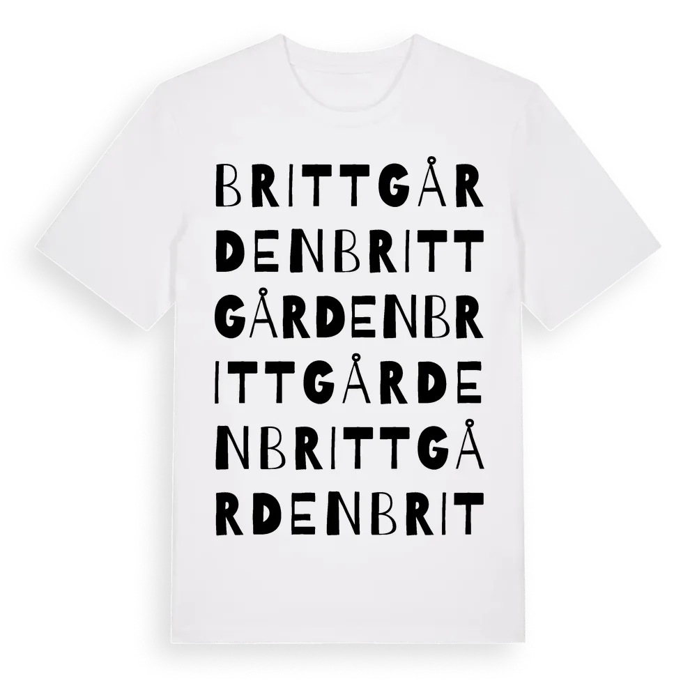 Brittgården ordlek t-shirt är inspirerad av Brittgården i Uppsala län, Sverige. Tröjan är designad för dig som har en speciell koppling till platsen – oavsett om du bor här, har rötterna här eller bara älskar Brittgården.