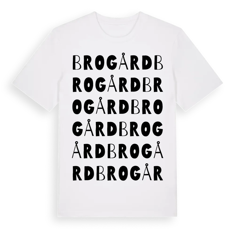 Brogård ordlek t-shirt är inspirerad av Brogård i Uppsala län, Sverige. Tröjan är designad för dig som har en speciell koppling till platsen – oavsett om du bor här, har rötterna här eller bara älskar Brogård.