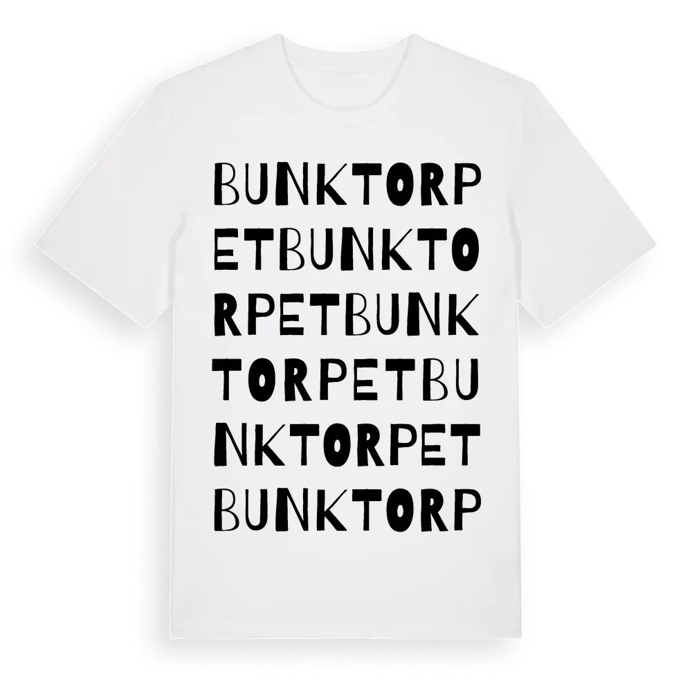 Bunktorpet ordlek t-shirt är inspirerad av Bunktorpet i Uppsala län, Sverige. Tröjan är designad för dig som har en speciell koppling till platsen – oavsett om du bor här, har rötterna här eller bara älskar Bunktorpet.