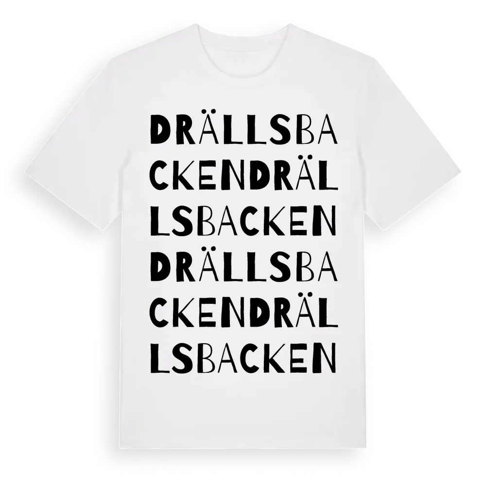 Drällsbacken ordlek t-shirt är inspirerad av Drällsbacken i Uppsala län, Sverige. Tröjan är designad för dig som har en speciell koppling till platsen – oavsett om du bor här, har rötterna här eller bara älskar Drällsbacken.