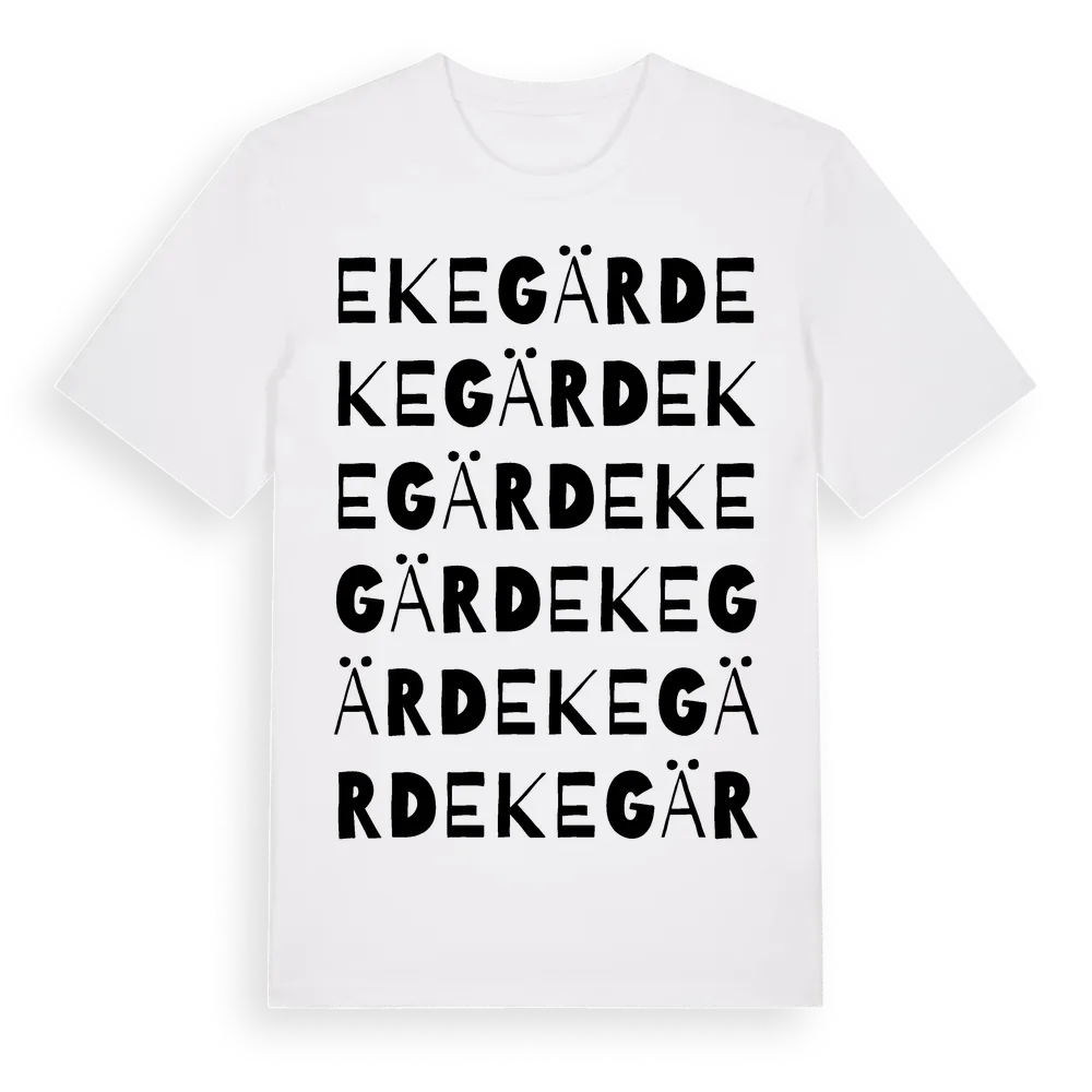 Ekegärd ordlek t-shirt är inspirerad av Ekegärd i Uppsala län, Sverige. Tröjan är designad för dig som har en speciell koppling till platsen – oavsett om du bor här, har rötterna här eller bara älskar Ekegärd.