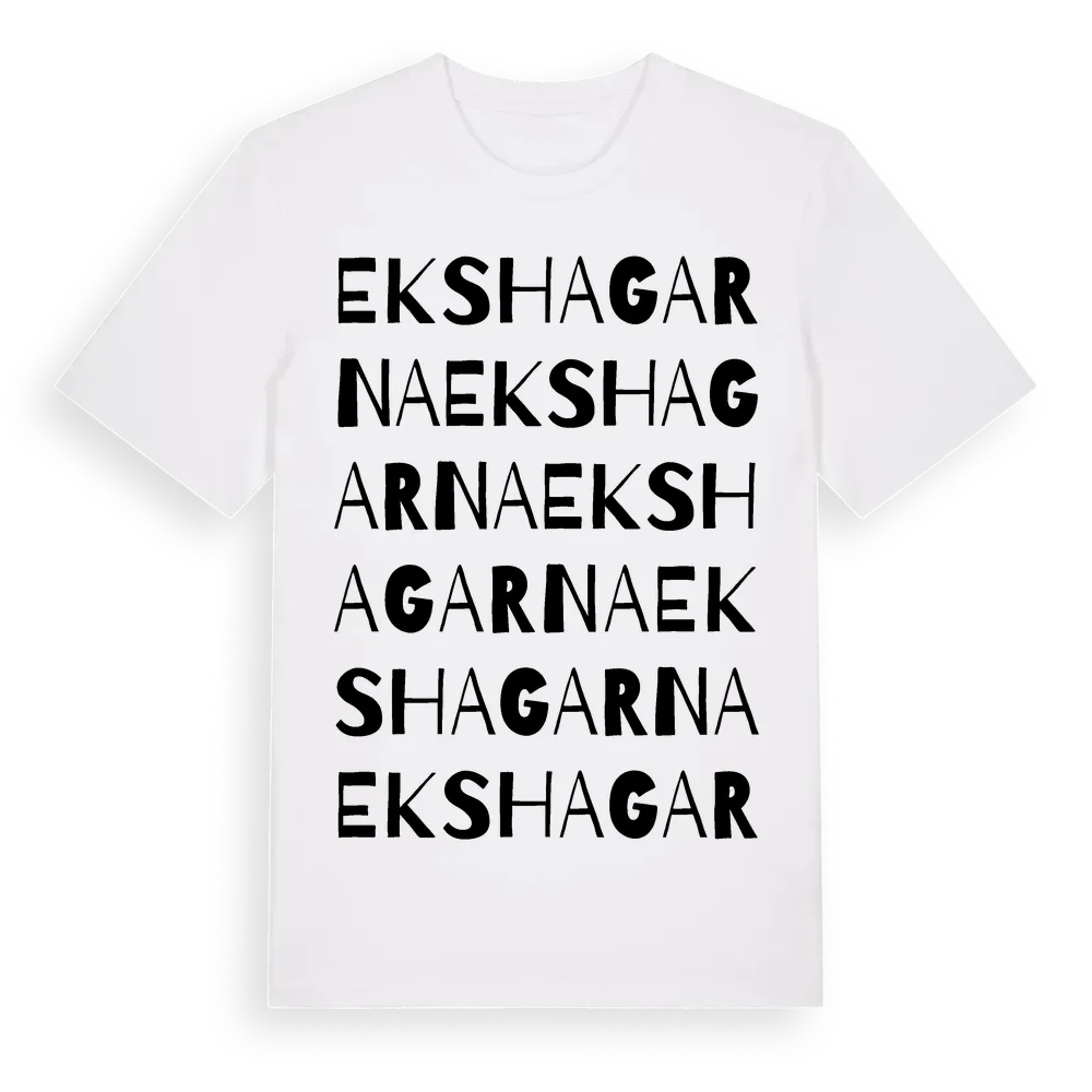Ekshagarna ordlek t-shirt är inspirerad av byn Ekshagarna i Uppsala län, Sverige. Tröjan är designad för dig som har en speciell koppling till platsen – oavsett om du bor här, har rötterna här eller bara älskar Ekshagarna.