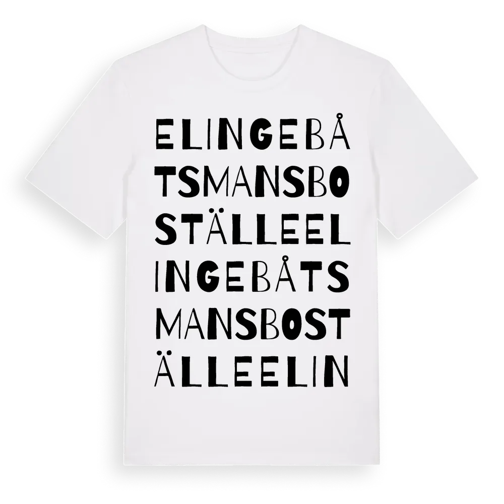 Elinge Båtsmansboställe ordlek t-shirt är inspirerad av Elinge Båtsmansboställe i Uppsala län, Sverige. Tröjan är designad för dig som har en speciell koppling till platsen – oavsett om du bor här, har rötterna här eller bara älskar Elinge Båtsmansboställe.