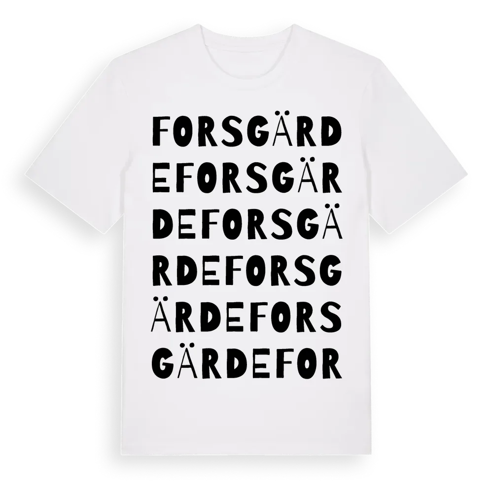 Forsgärde ordlek t-shirt är inspirerad av byn Forsgärde i Uppsala län, Sverige. Tröjan är designad för dig som har en speciell koppling till platsen – oavsett om du bor här, har rötterna här eller bara älskar Forsgärde.