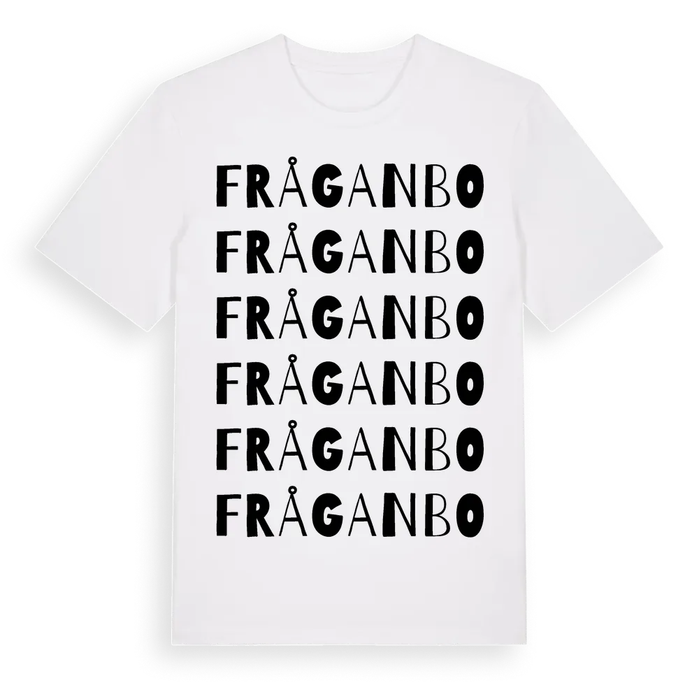 Fråganbo ordlek t-shirt är inspirerad av Fråganbo i Uppsala län, Sverige. Tröjan är designad för dig som har en speciell koppling till platsen – oavsett om du bor här, har rötterna här eller bara älskar Fråganbo.