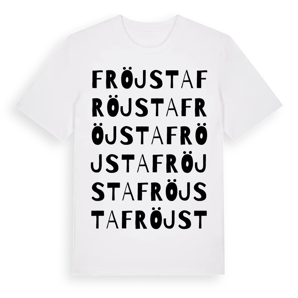 Fröjsta ordlek t-shirt är inspirerad av Fröjsta i Uppsala län, Sverige. Tröjan är designad för dig som har en speciell koppling till platsen – oavsett om du bor här, har rötterna här eller bara älskar Fröjsta.