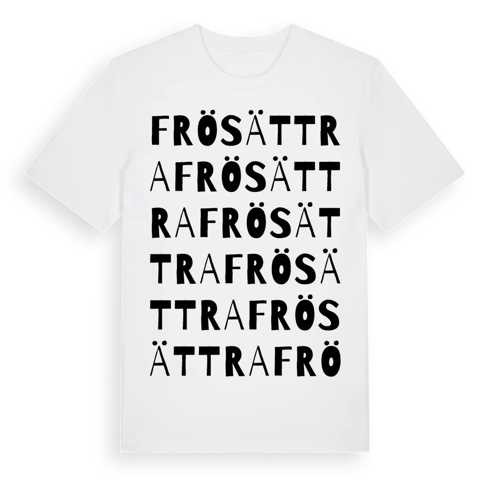 Frösättra ordlek t-shirt är inspirerad av Frösättra i Uppsala län, Sverige. Tröjan är designad för dig som har en speciell koppling till platsen – oavsett om du bor här, har rötterna här eller bara älskar Frösättra.