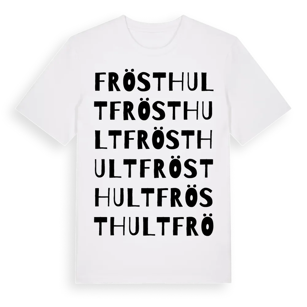 Frösthult ordlek t-shirt är inspirerad av byn Frösthult i Uppsala län, Sverige. Tröjan är designad för dig som har en speciell koppling till platsen – oavsett om du bor här, har rötterna här eller bara älskar Frösthult.
