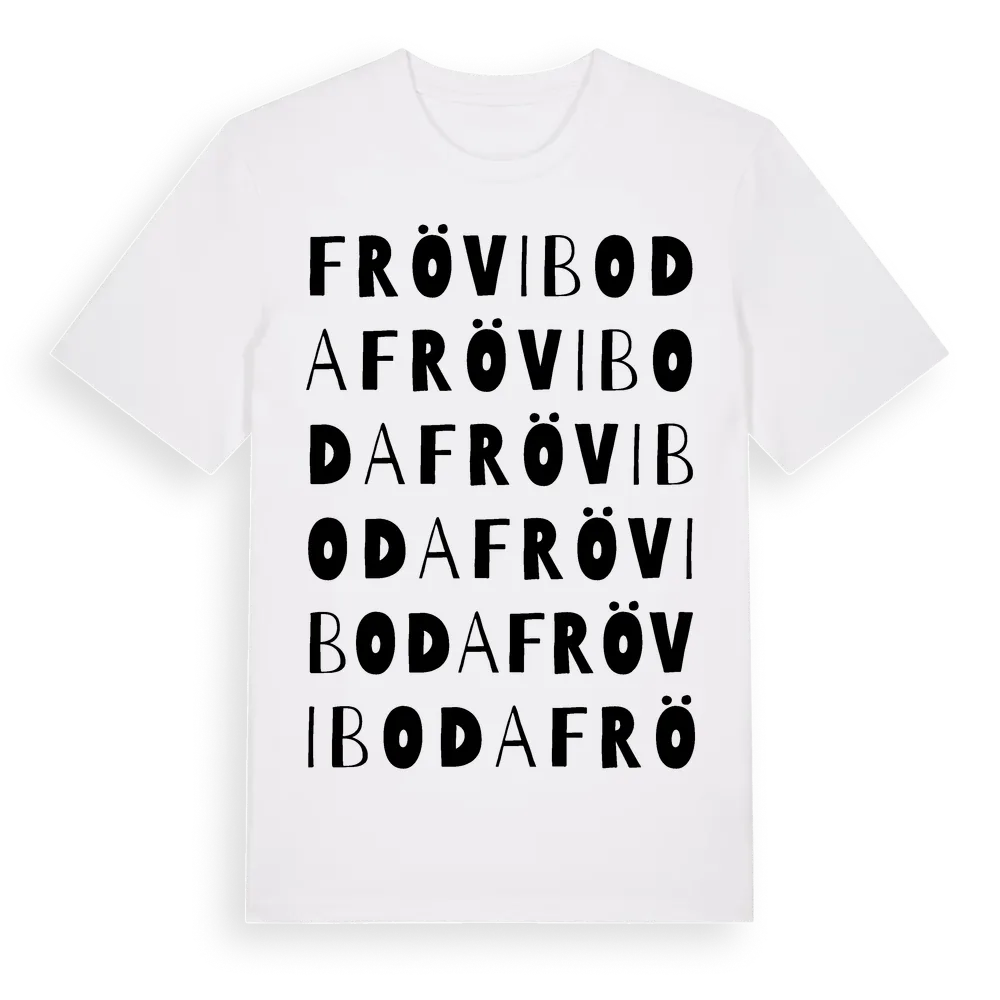 Fröviboda ordlek t-shirt är inspirerad av Fröviboda i Uppsala län, Sverige. Tröjan är designad för dig som har en speciell koppling till platsen – oavsett om du bor här, har rötterna här eller bara älskar Fröviboda.